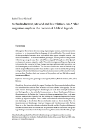 Although the Koran encourages overcoming genealogical relationship patters, medieval Arabic texts continued to be characterized by the language of tribe and kinship. The most important central themes of this genealogical narrative, which often seem related, were 1. the Arabic tribal system; 2. its relation to biblical genealogies and to the positioning of the prophets within this genealogical net; 3. the so-called “Meccan Legends” surrounding the rise of the Quraysh as a hegemonic group; 4. myths of wandering. This article uses a telling example to illustrate how, in a complex genealogical narrative that deals with each of these themes, a tightly woven network of associations and ties between groups and individuals was produced that served to valorize and glorify Arab ethnicity, Arabia as a space of divine activity and the prophet Muḥammad. The subject is the legend of the Babylonian king Nebuchadnezzar’s expulsion of Maʿadd, the eponym of the Northern Arabs and ancestor of the prophet, and of Maʿadd’s eventual immigration to Mecca.